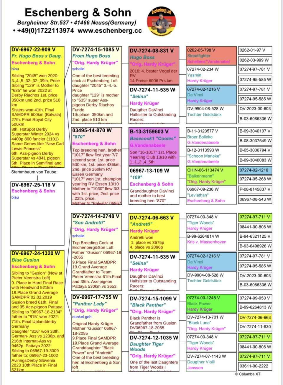 Dam: “Blue Gusion” is 100% Hardy Kruger and off two original Hardy birds.  Her full sister won 9th SAMDPR Final, 19th Grand Average and was purchased by Pieter Veenstra and bred 35th Ace Pigeon Pattaya and 61st Pattaya OLR Final.