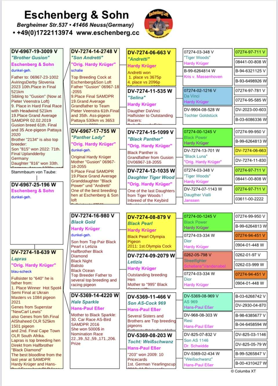 Sire: “Brother Gusion” is father to 10th Avirings Derby OLR Final, and full brother to “Gusion” who won 9th SAMDPR Final, 19th Grand Average. He is a son of two original Hardy Kruger birds.